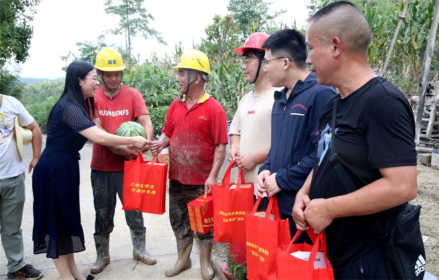 在娄底:7月27日,副所长、工会主席黎海波携相关工作人员走访慰问了水文环境地质中心承担的“涟源市湄江沙坪煤矿和七星街仙田、土珠煤矿废弃煤矿区地下水环境状况调查评估”项目的野外现场。每到一处工地,黎海波都仔细询问职工的生产生活和劳动安全等情况,并亲自为一线职工送去了西瓜、凉茶等防暑降温物资。同时,对他们不畏高温、坚守岗位的劳动精神表示感谢,并叮嘱他们劳逸结合,在外工作时一定要把安全放在首位,特别是露天作业要避开高温时段,确保职工的安全和健康。