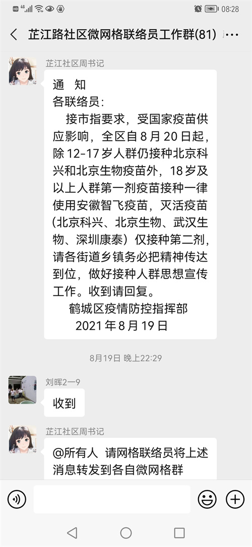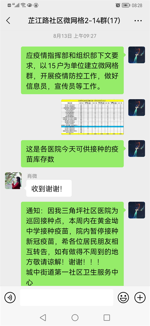 6、积极配合疫情防控:为切实筑牢疫情防控安全屏障,提高新冠疫苗接种工作的群众知晓率,8月我队配合芷江路社区建设了38个以15户居民为单位的微网格群,开展疫情防控信息员、宣传员工作;并引导督促全队职工积极接种新冠疫苗,确保疫苗工作全面铺开,不漏一户、不落一人。