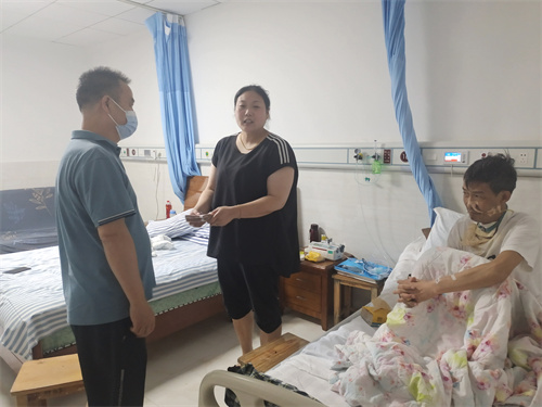 (图为队党委书记邓平华到医院看望慰问患癌职工丁立平)